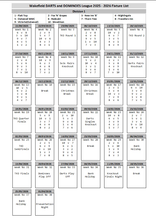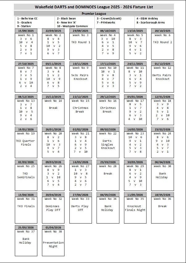 Wakefield Darts & Dominoes League 2025/2026 Fixture List